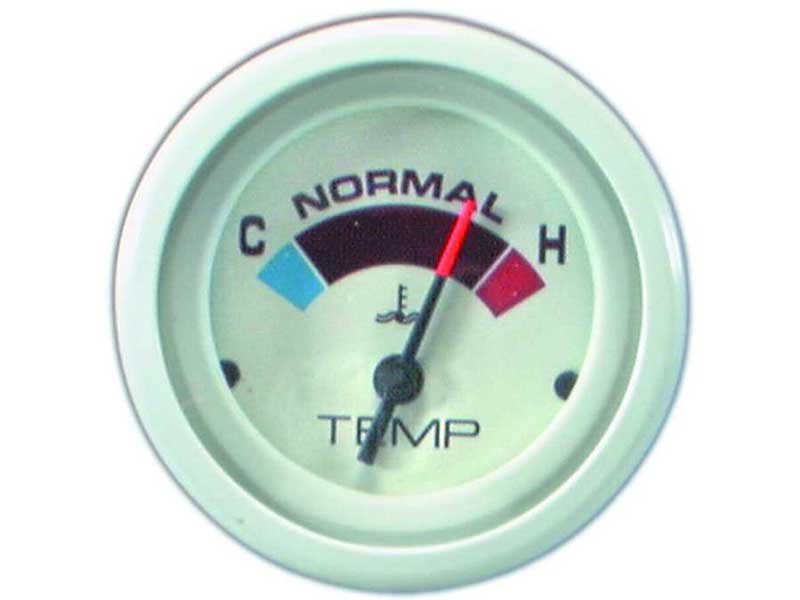 Relógio indicador temperatura de água Mercury para motores a Diesel, possui aro com 6,1 cm de diâmetro com acabamento branco e fundo do mostrador com barra indicadora colorida, 12 Volts.